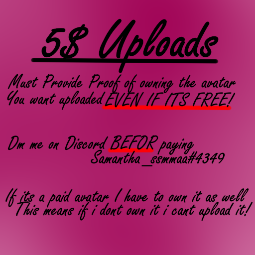 if you want a paid avatar uploaded that i not own you will need to gift the avatar to me, the price of upload will be discounted due to this. (50%)